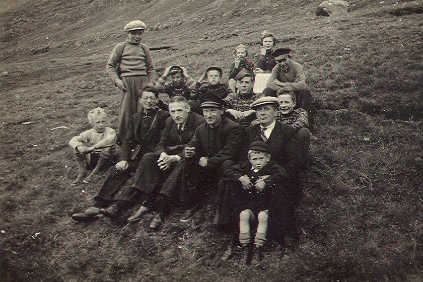 Sitandi: Tamar Samson, Jóhannes Heinesen av Viðareiði, Hanus í Ánunum, Petur Hans hjá Samson, smádrongur, aftanfyri hann: Jákup hjá Jensi á Viðareiði, smádrongur, Sørin Úti á Lagnum, Jens Viderø og Dahl Sørensen, allir av Viðareiði, og Olaf í Múla.
