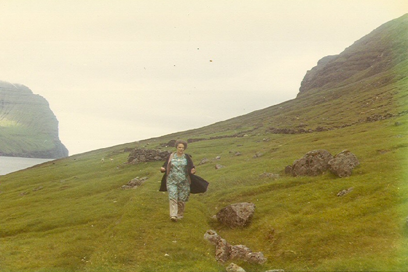 1. Karolina Jacobsen (Linga) f. 13.12.1890 á Skálatoftum. - Linga hevur pyntað seg fyri kongi. Myndin er tikin niðanfyri skúlagarðin í 1963.